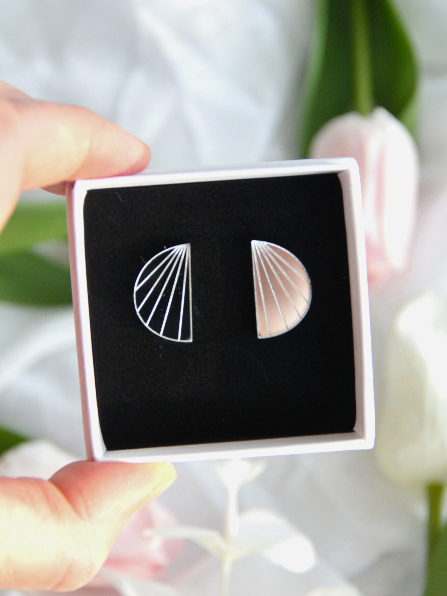 Peiliakryyli ei kuitenkaan kestä kemiallisia puhdistusaineita, eikä hajuvettä tai hiuslakkaa. Laitathan korvikset aina viimeisenä korvaan. Pintaa voit pyyhkiä kevyesti pehmeällä mikrokuituliinalla. Peilipinta on myös helppo naarmuuntumaan, joten säilytäthän korut aina korurasiassa. Huomioithan, että peiliakryylin tausta on harmaa, eli peilaava pinta on vain tuotteen etupuolella.