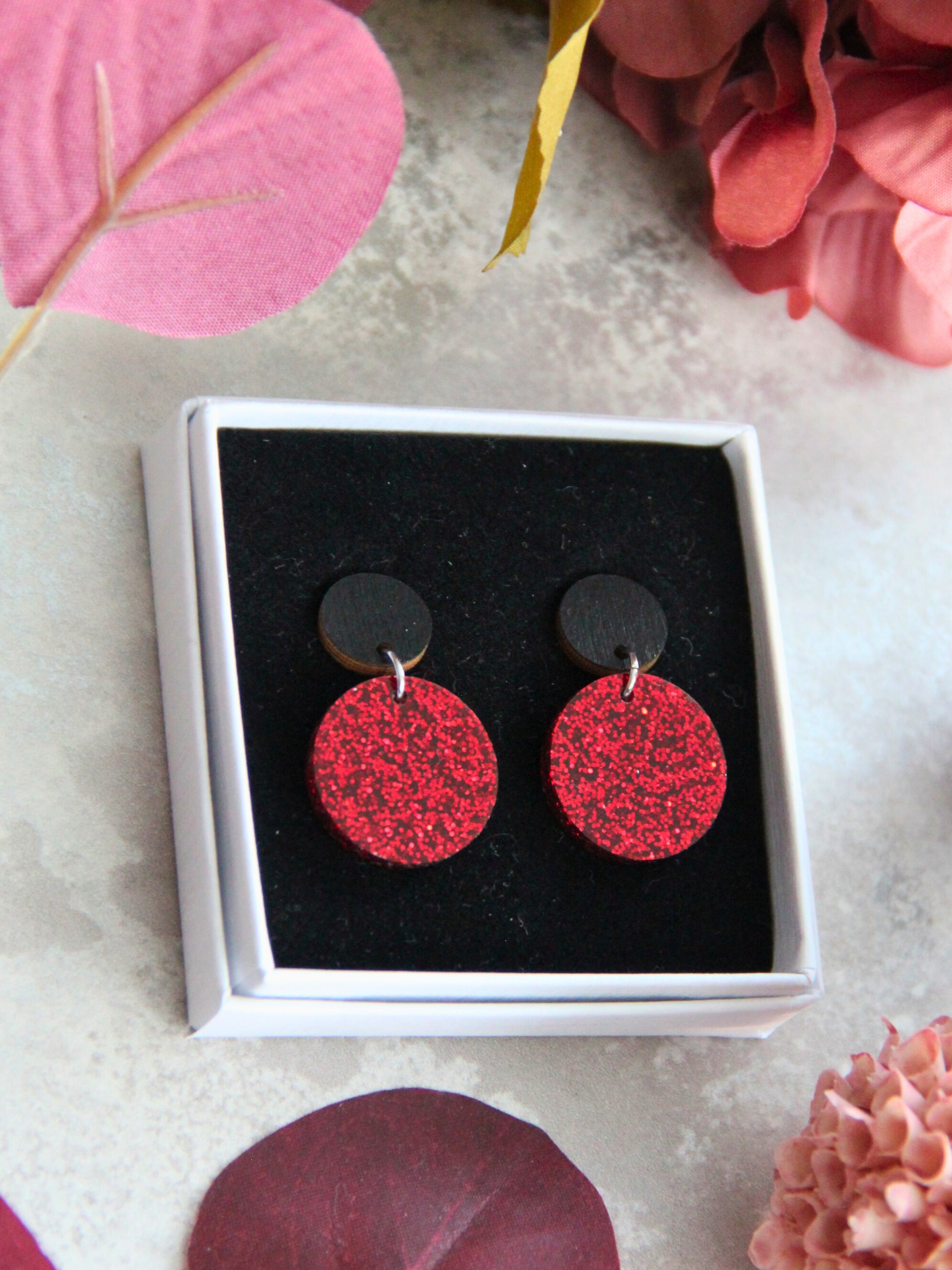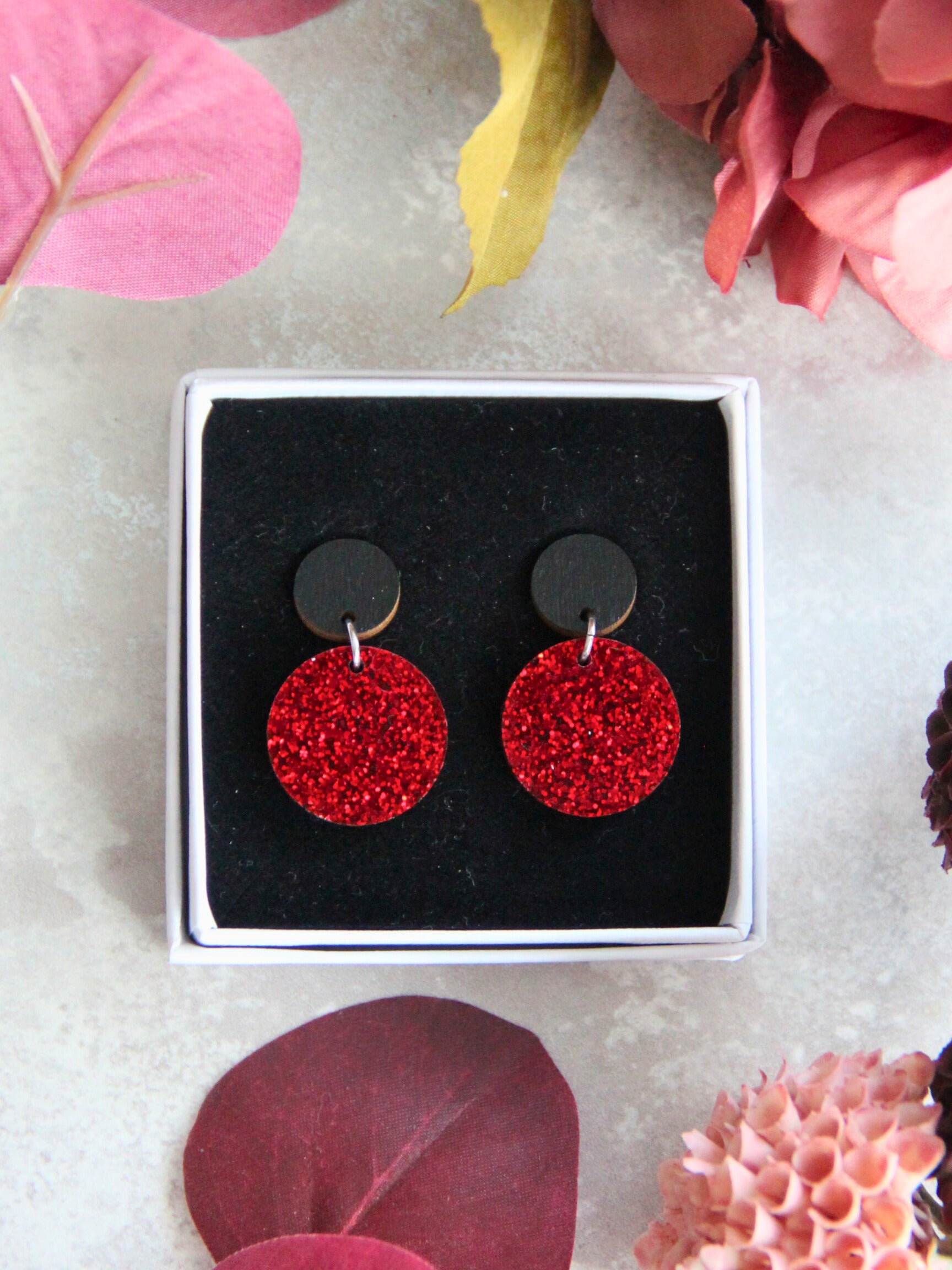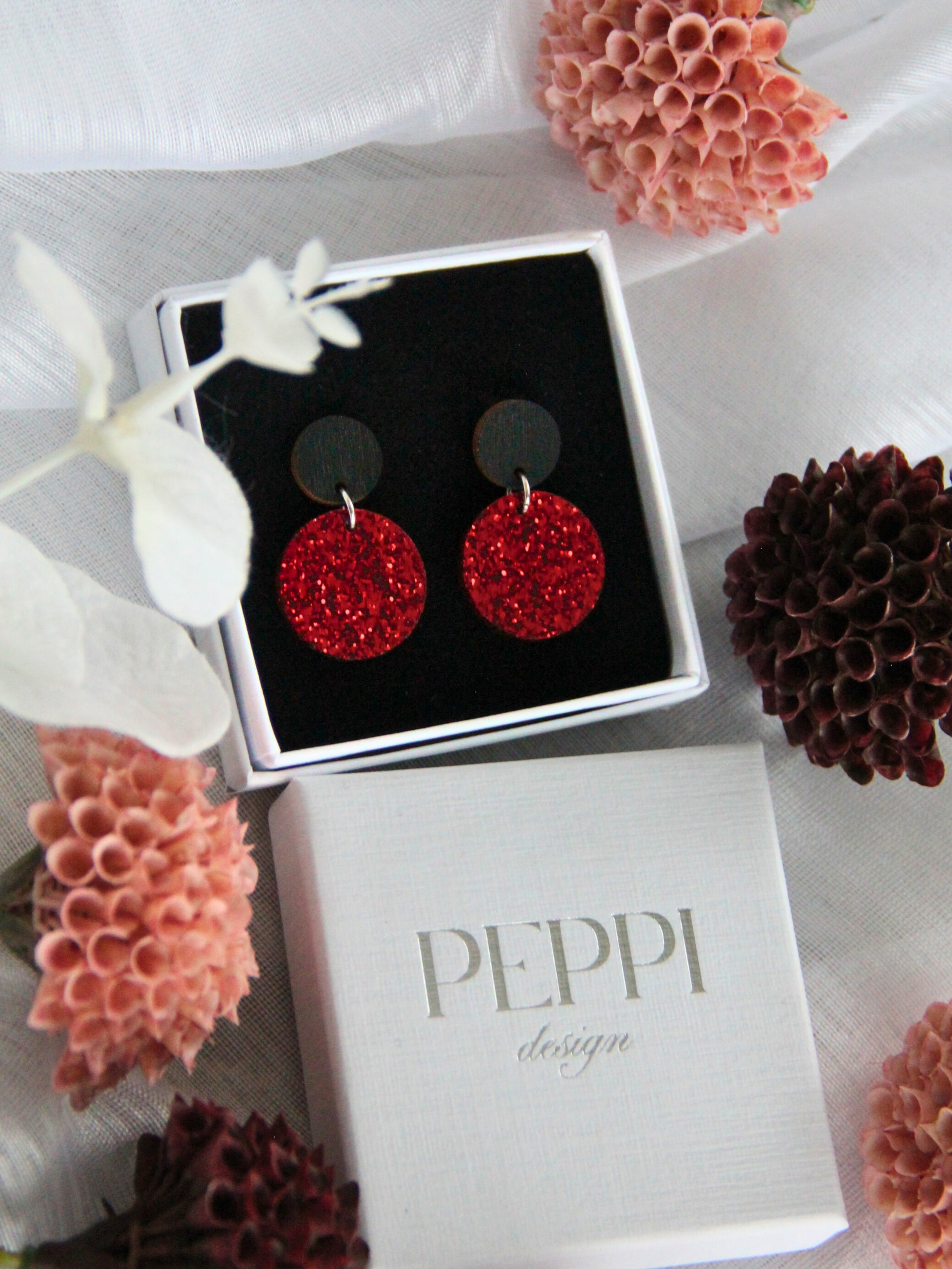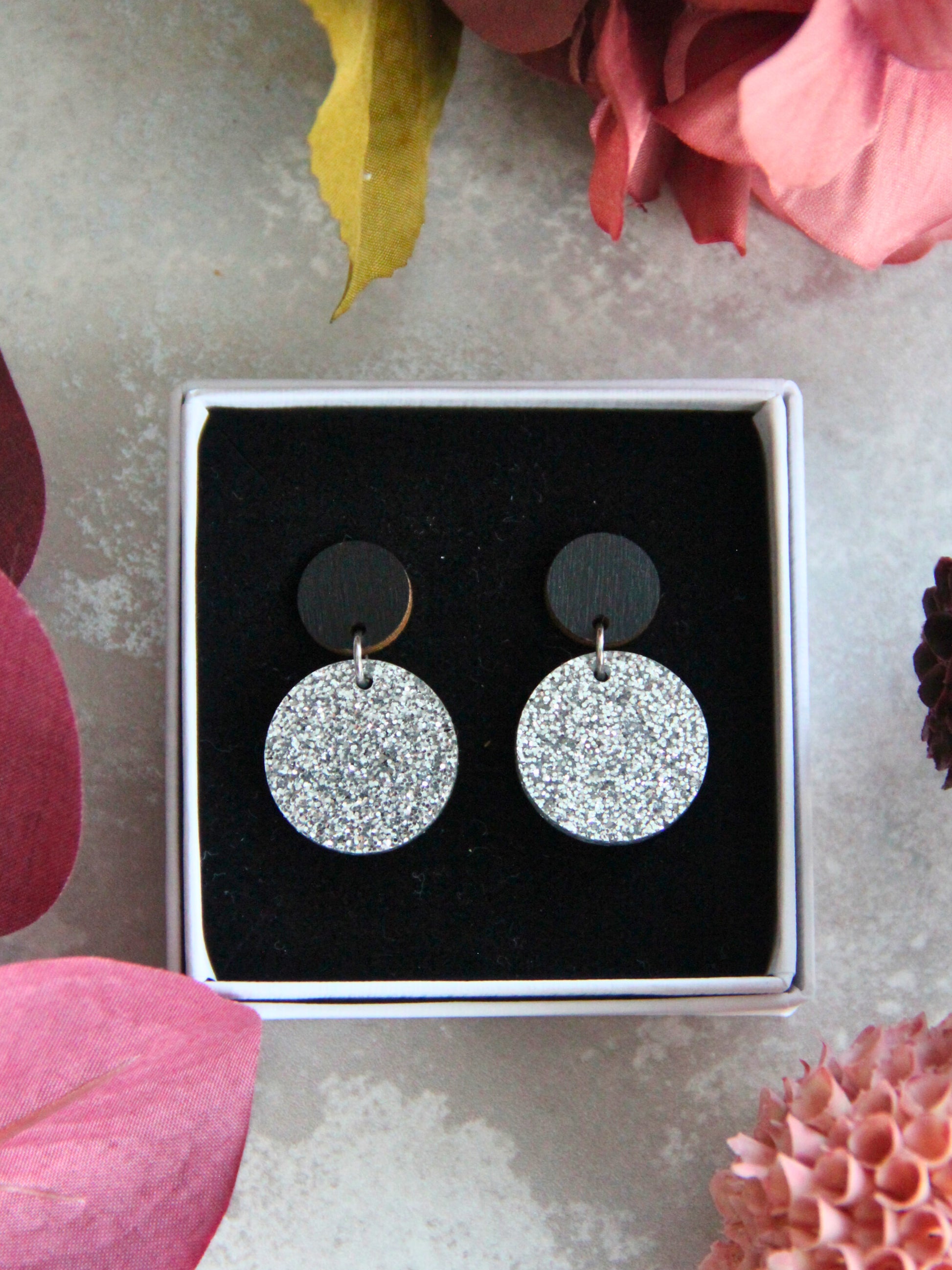 Double Bubble -korvikset sopivat täydellisesti juhla-aikaan. Upean kiiltävä glitterakryyli yhdistettynä mustaksi maalattuun koivuvaneriin luovat näyttävän yhdistelmän.