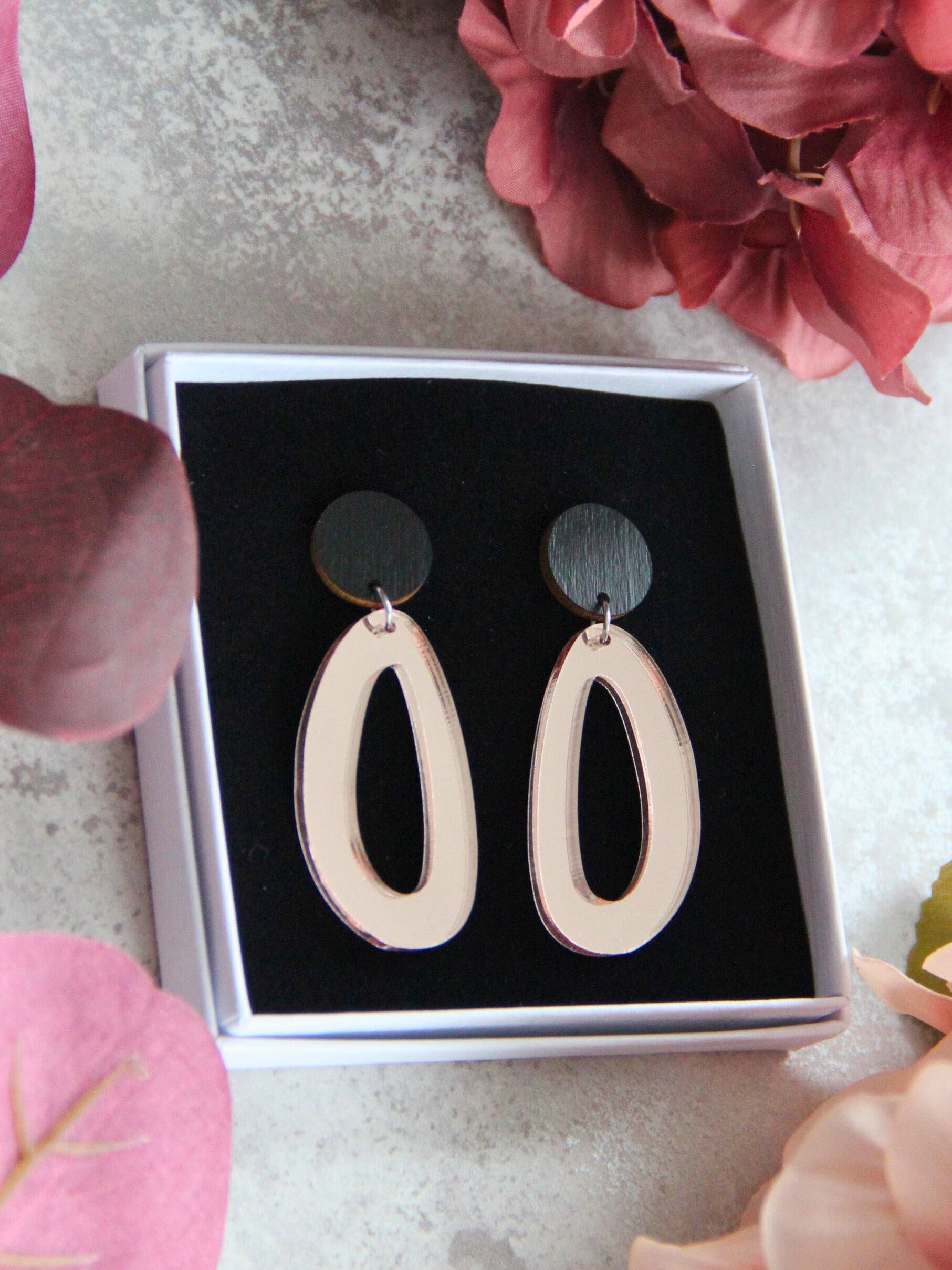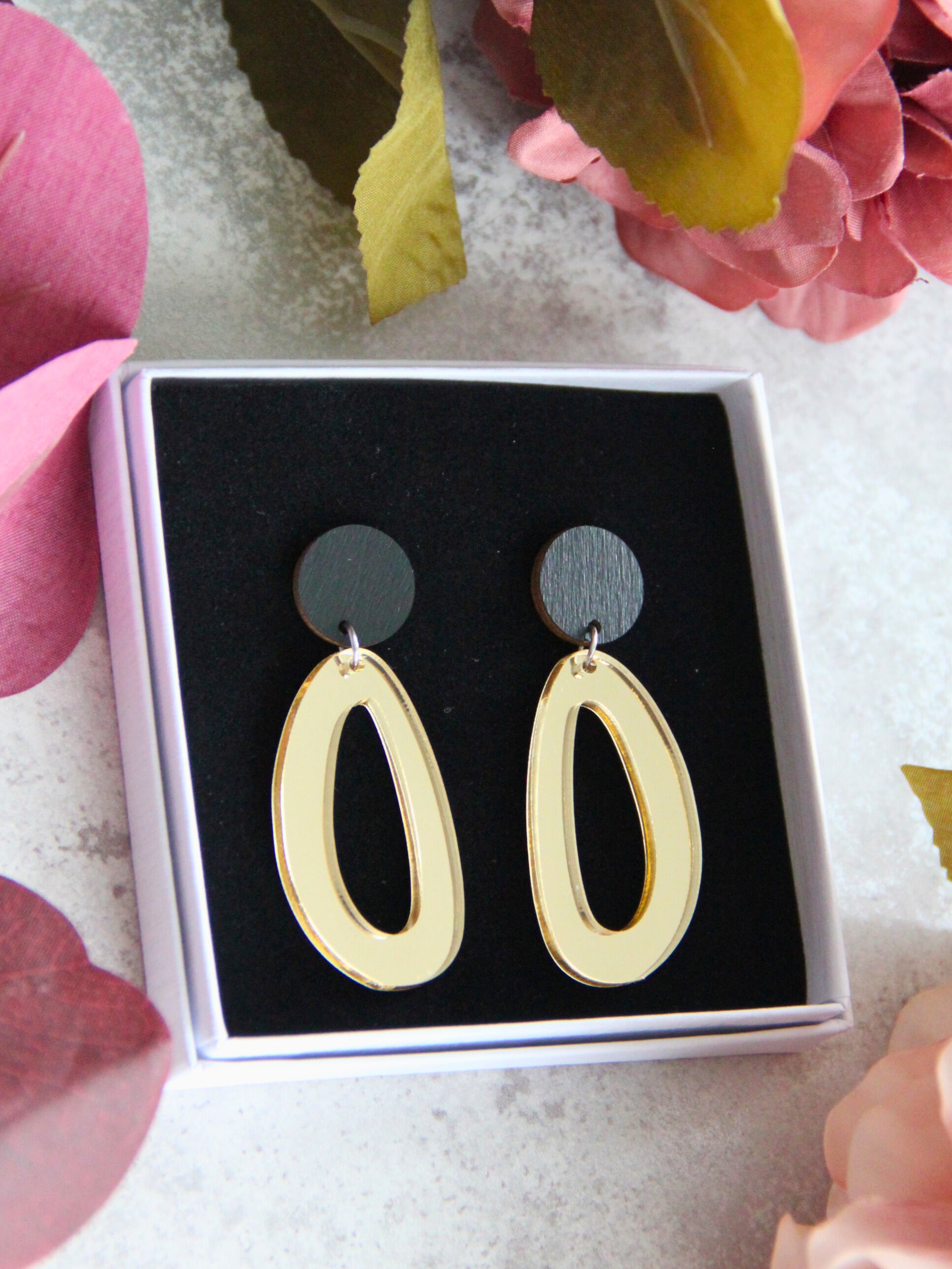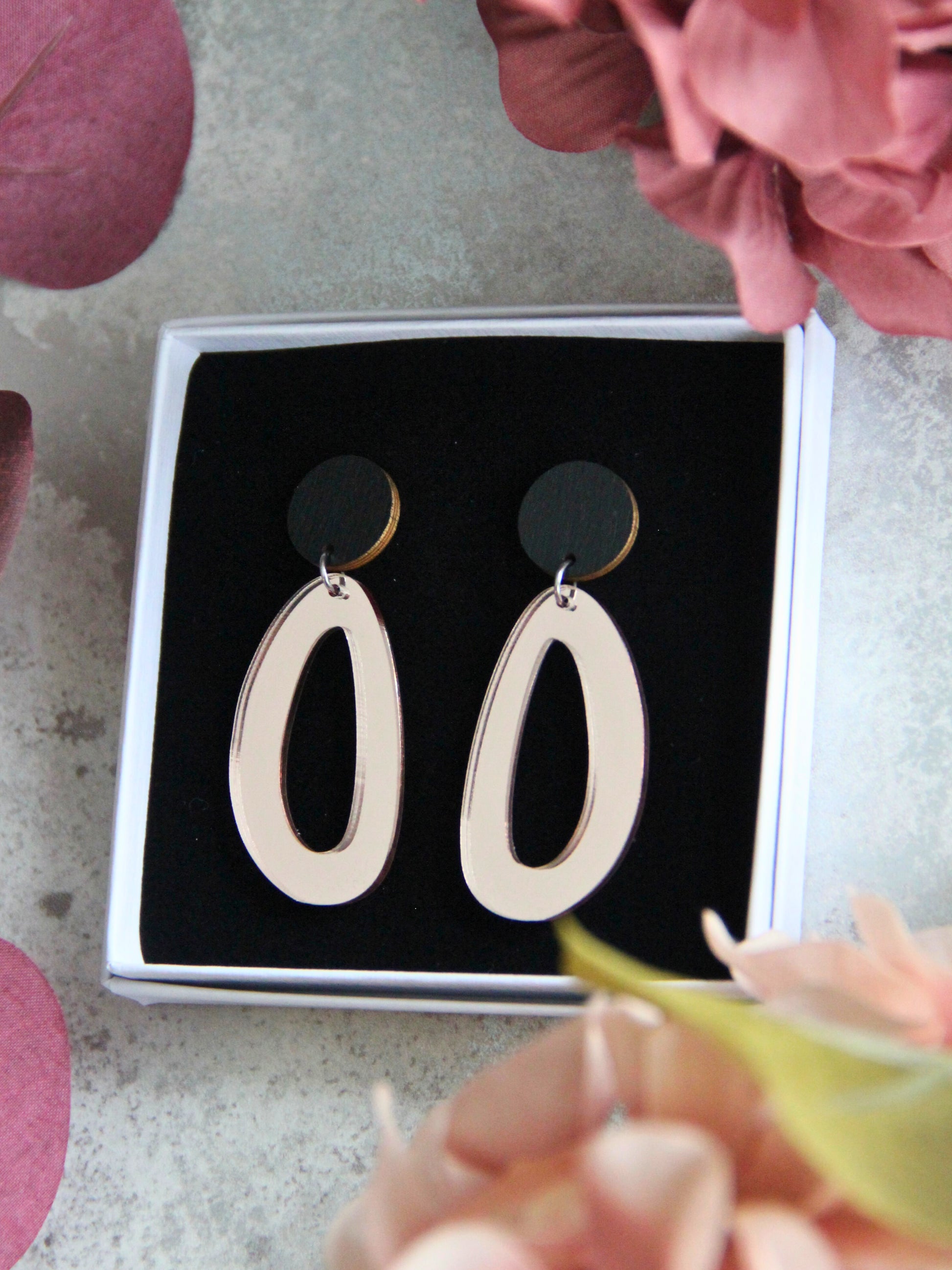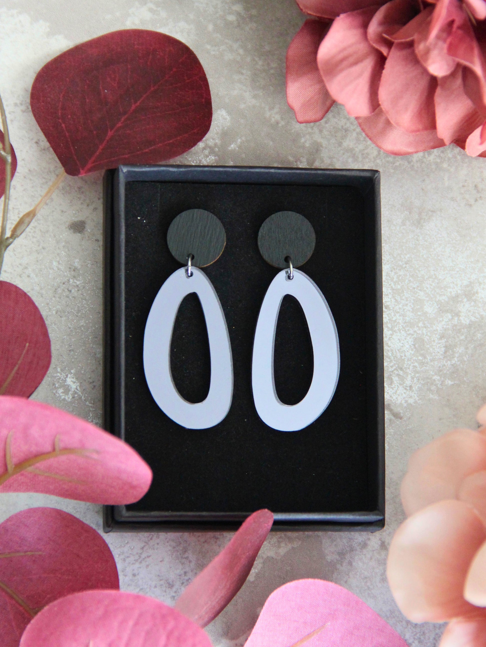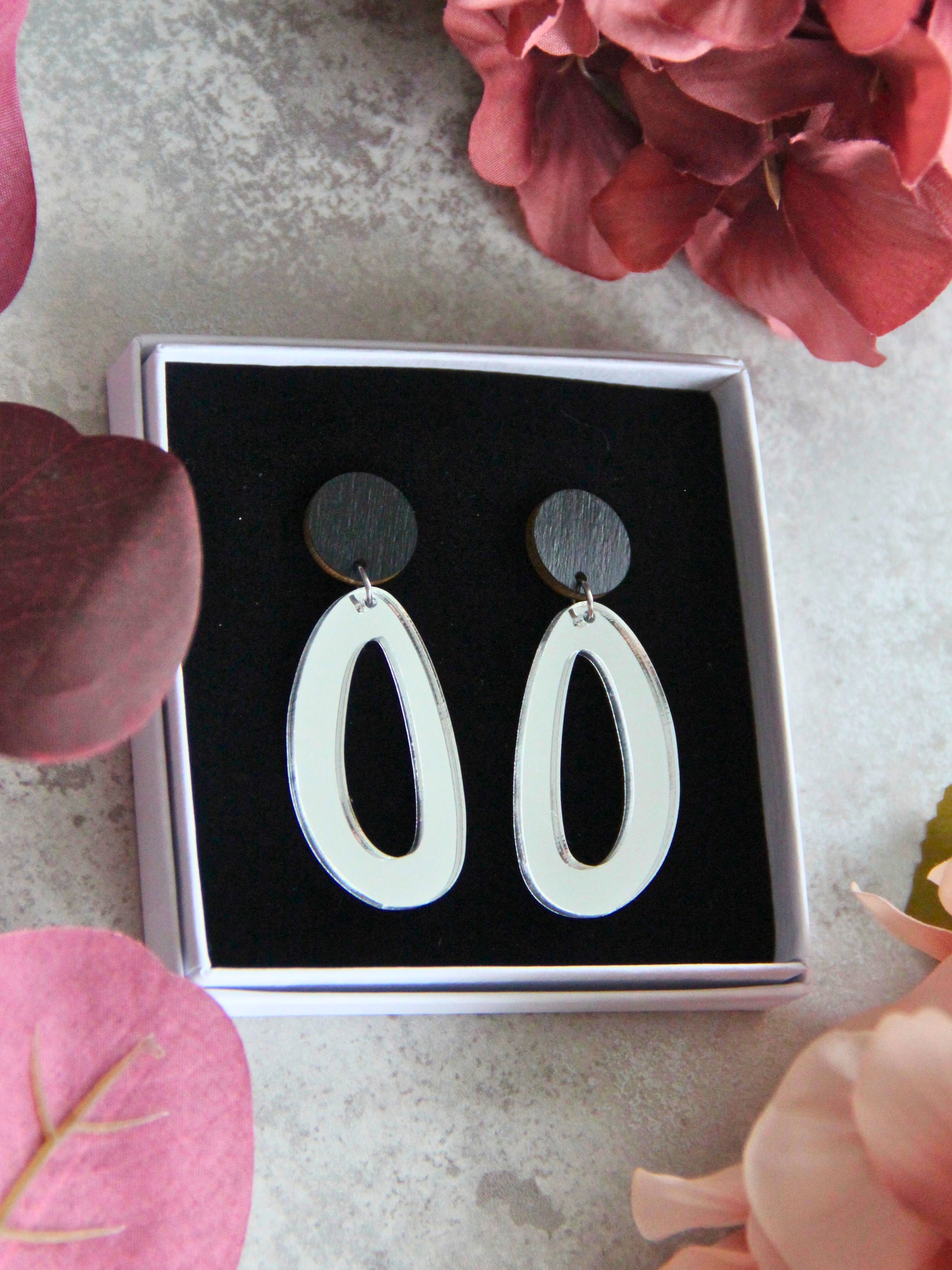Eleonora-korvikset ovat ihanan epäsymmetriset ja juuri siksi niin hurmaavat. Peiliakryyli yhdistettynä mustaksi maalattuun koivuvaneriin luo elegantin yhdistelmän.