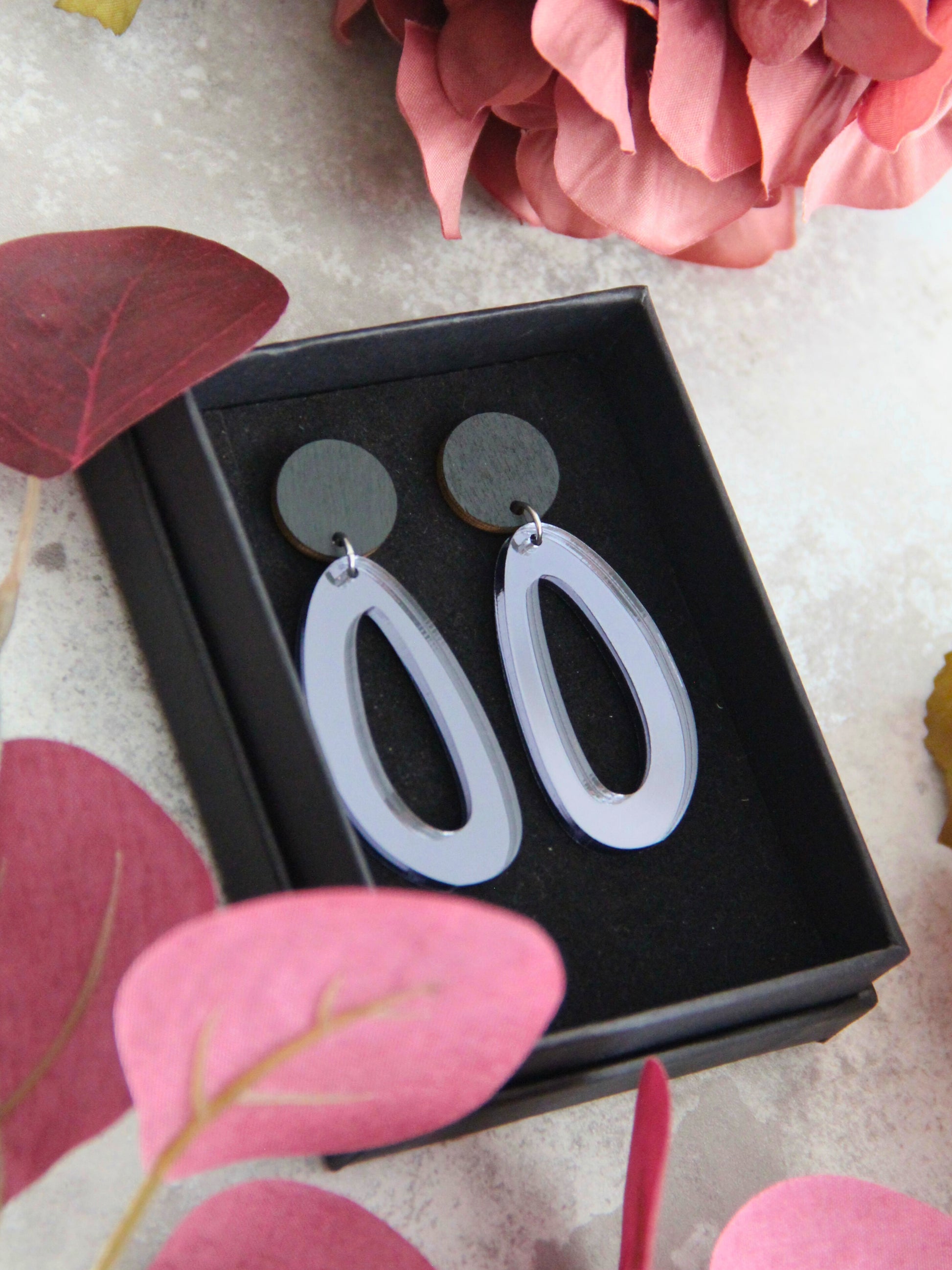 Eleonora-korvikset ovat ihanan epäsymmetriset ja juuri siksi niin hurmaavat. Peiliakryyli yhdistettynä mustaksi maalattuun koivuvaneriin luo elegantin yhdistelmän.