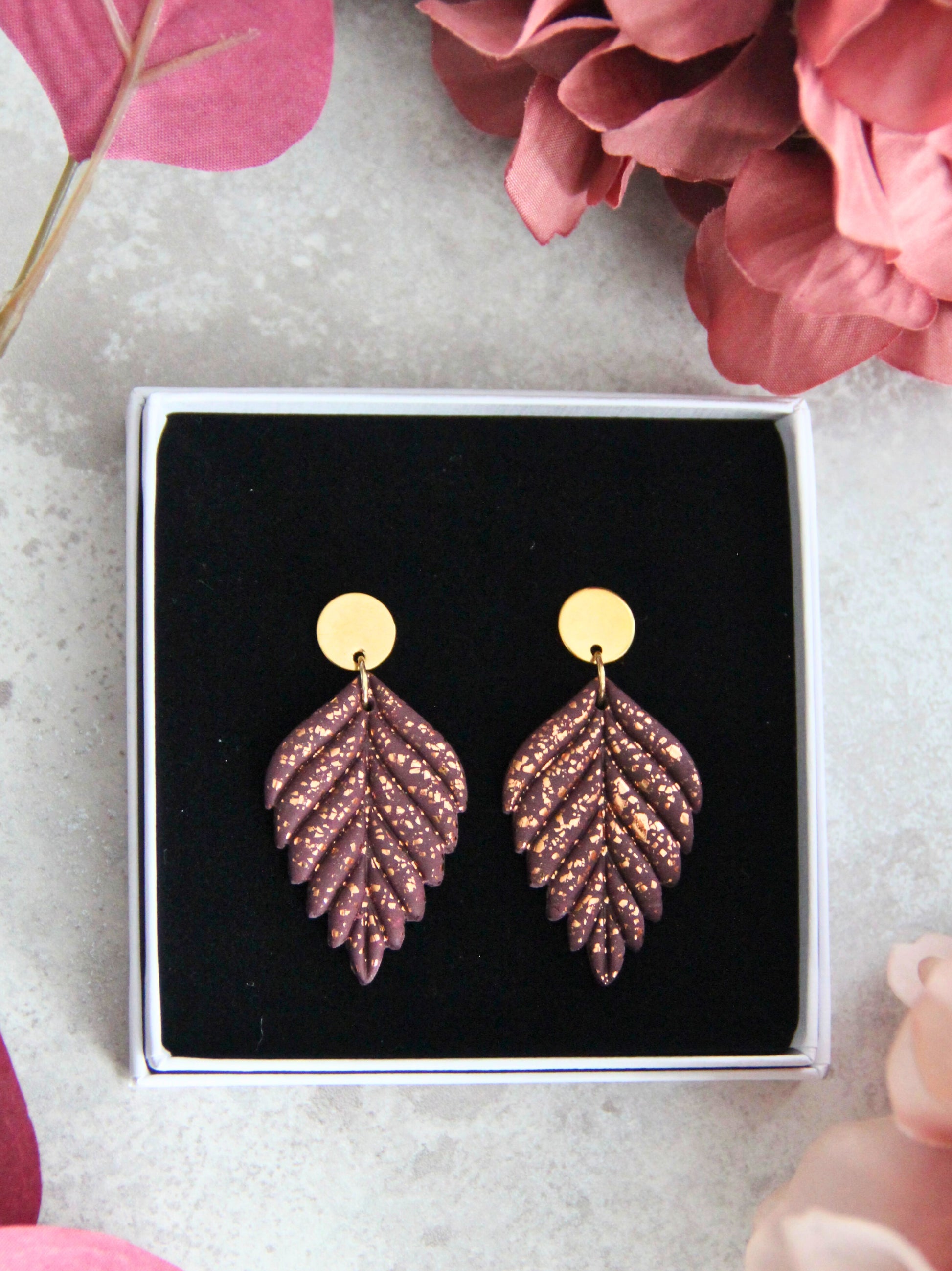 Näissä purppuranpunaisissa Lilja-korviksissa hehkuu ruusukultaiset lehtikultahiput. Nämä sopivat täydellisesti talven juhliin.