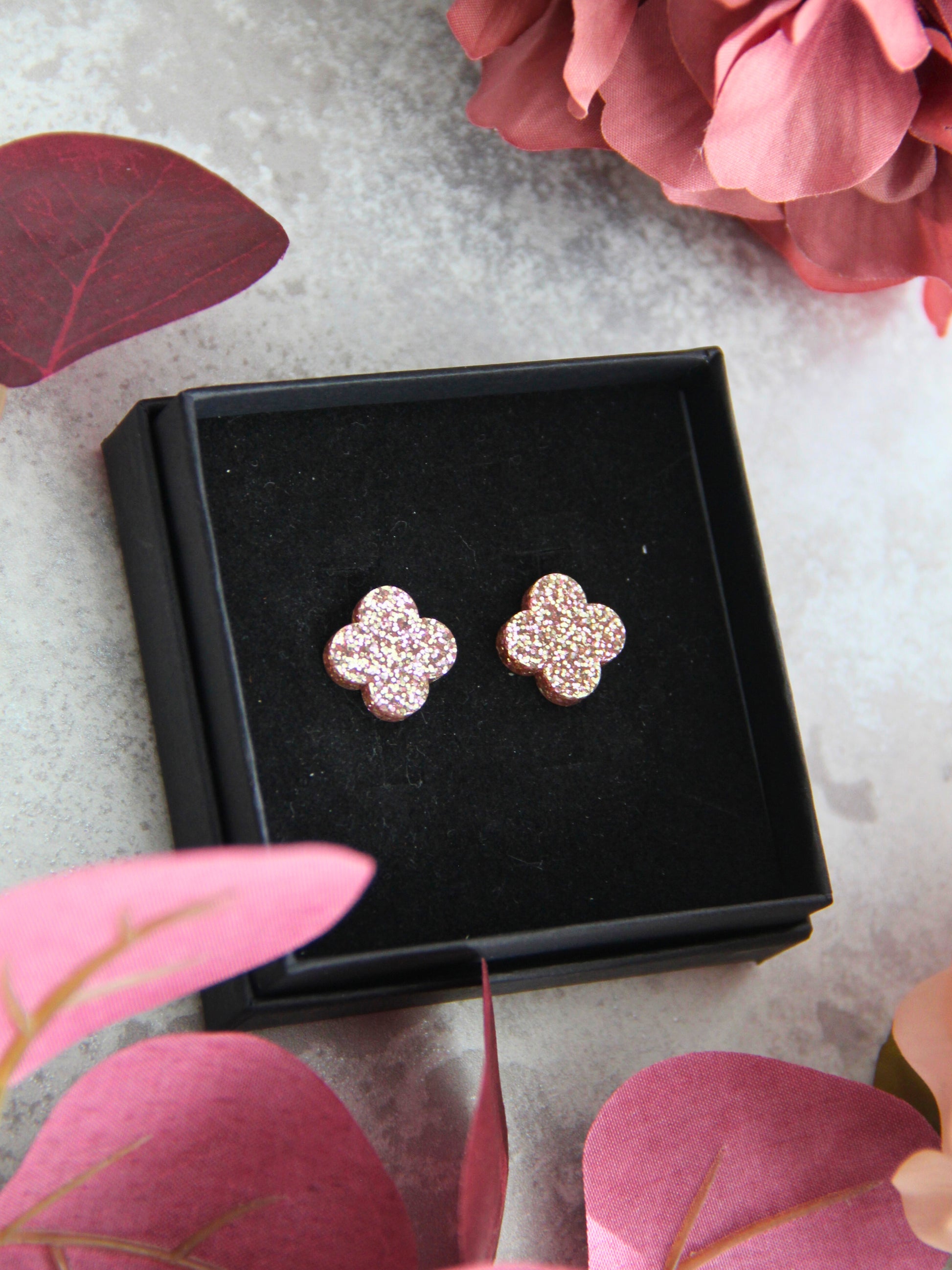 Lucky-nappikorvikset tuovat päiviisi onnea ja loistoa. Näissä näyttävissä korviksissa kimaltelee ruusukultainen glitter ja ne loistavat kilpaa auringon kanssa. Kuviona onnea tuova neliapila.