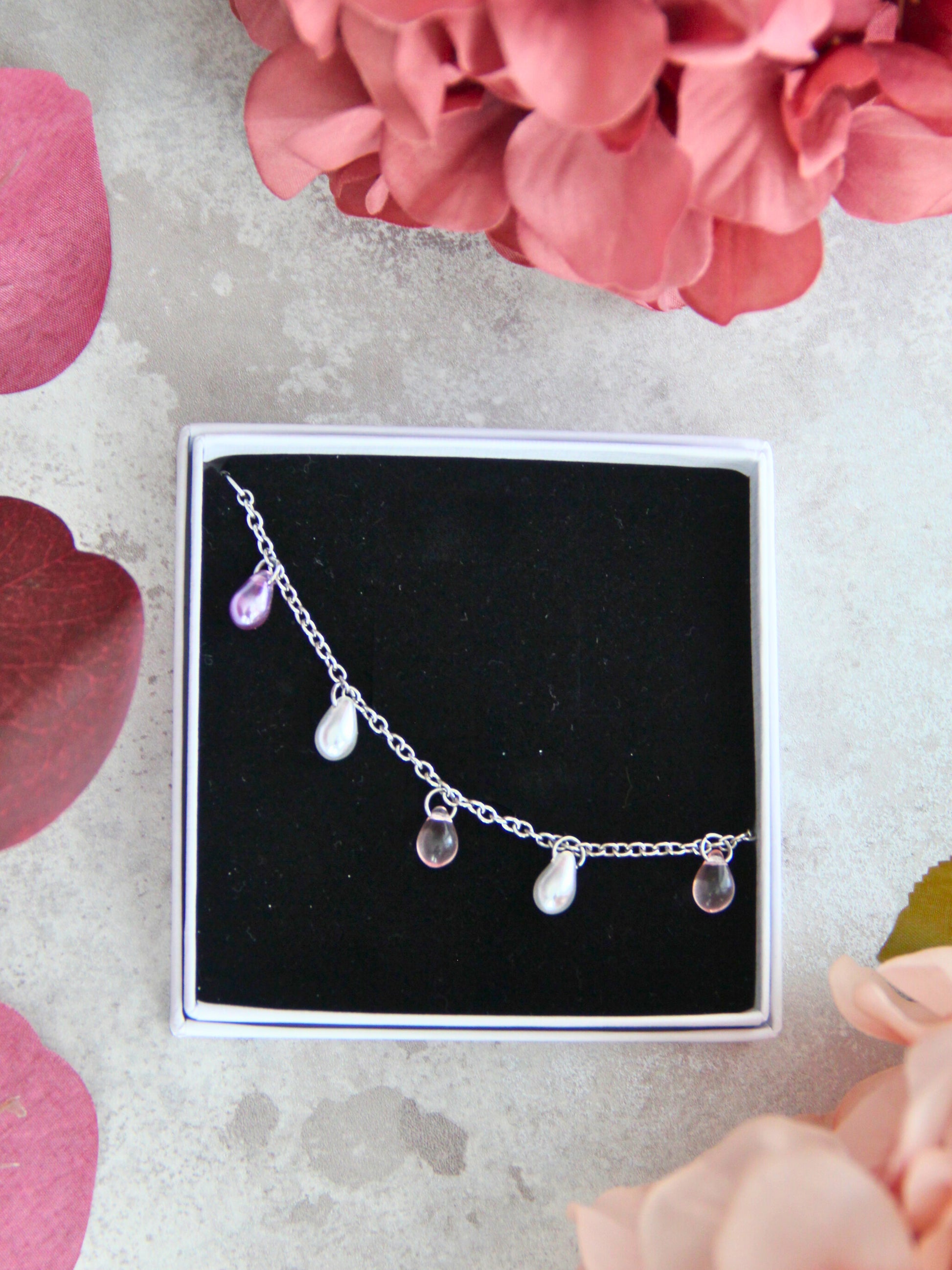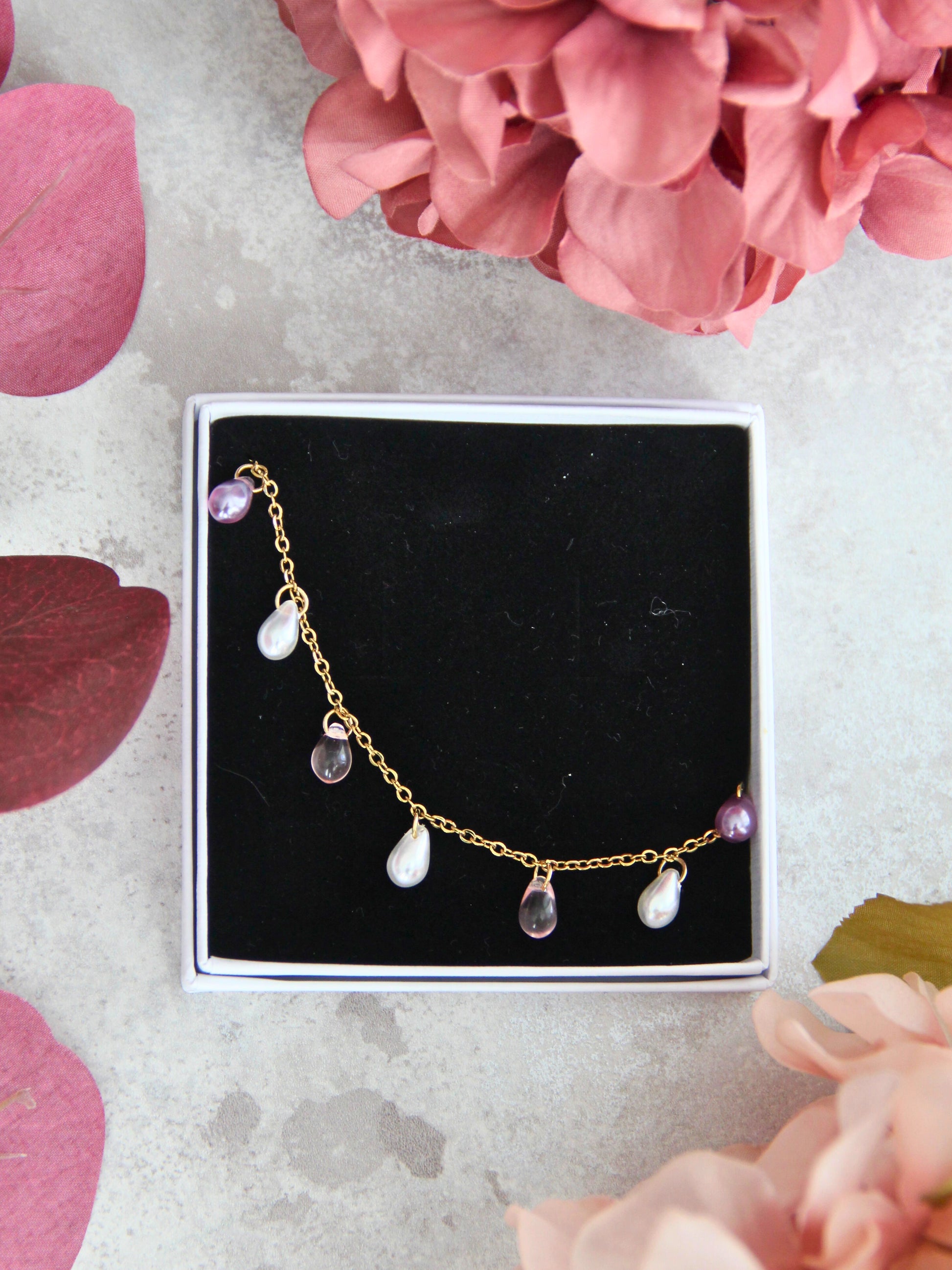 Pearl-rannekorussa hehkuvat kauniit läpikuultavat pisarahelmet. Tässä rannekorussa kimaltelee roosa, lila ja valkoinen helmiäinen.