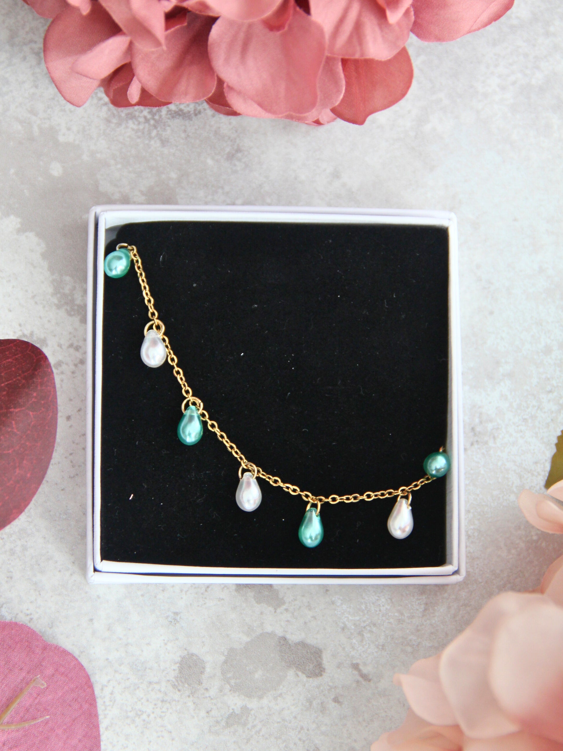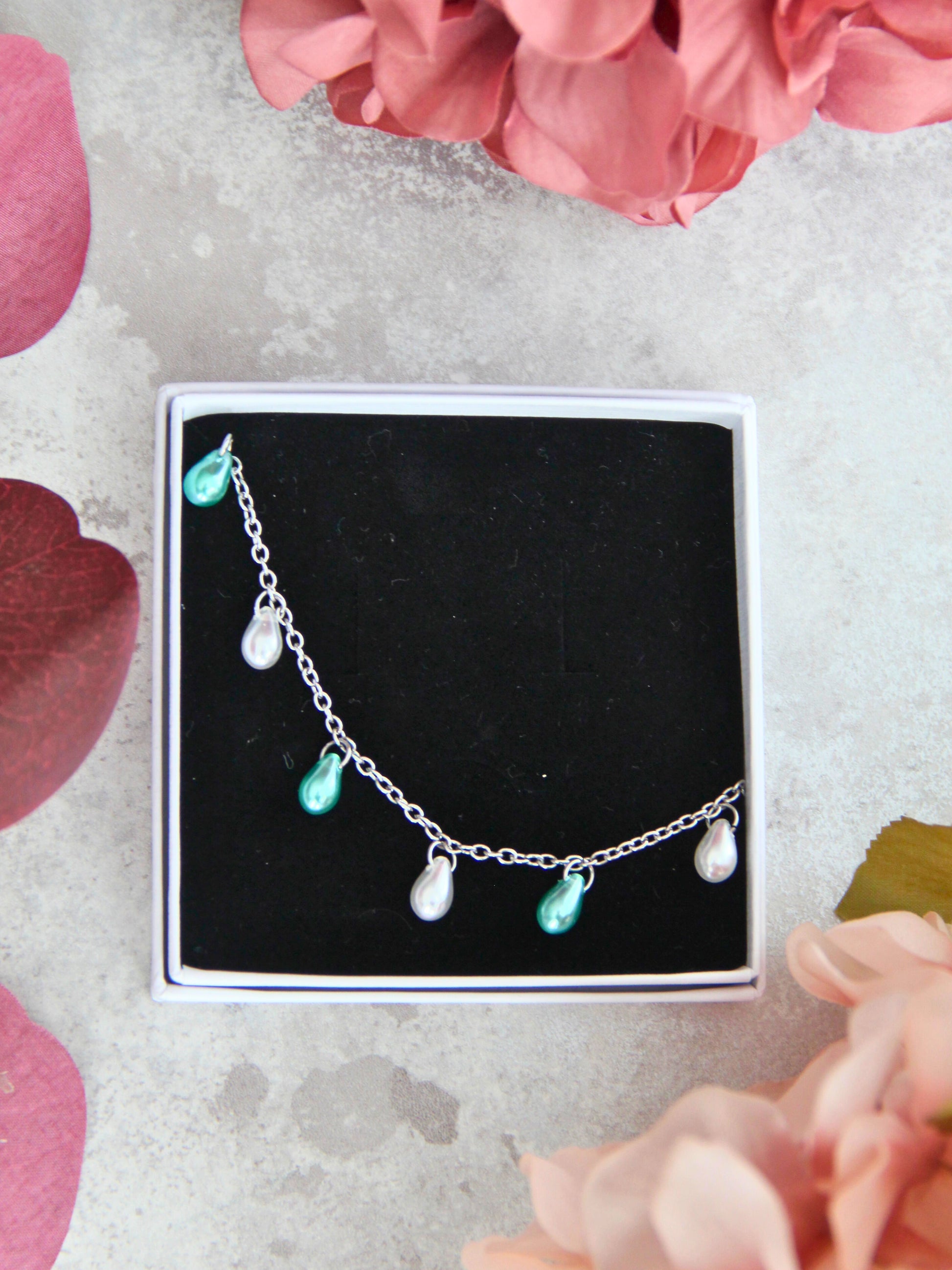 Pearl-rannekorussa hehkuvat kauniit läpikuultavat pisarahelmet. Tässä rannekorussa kimaltelee turkoosi ja valkoinen helmiäinen.