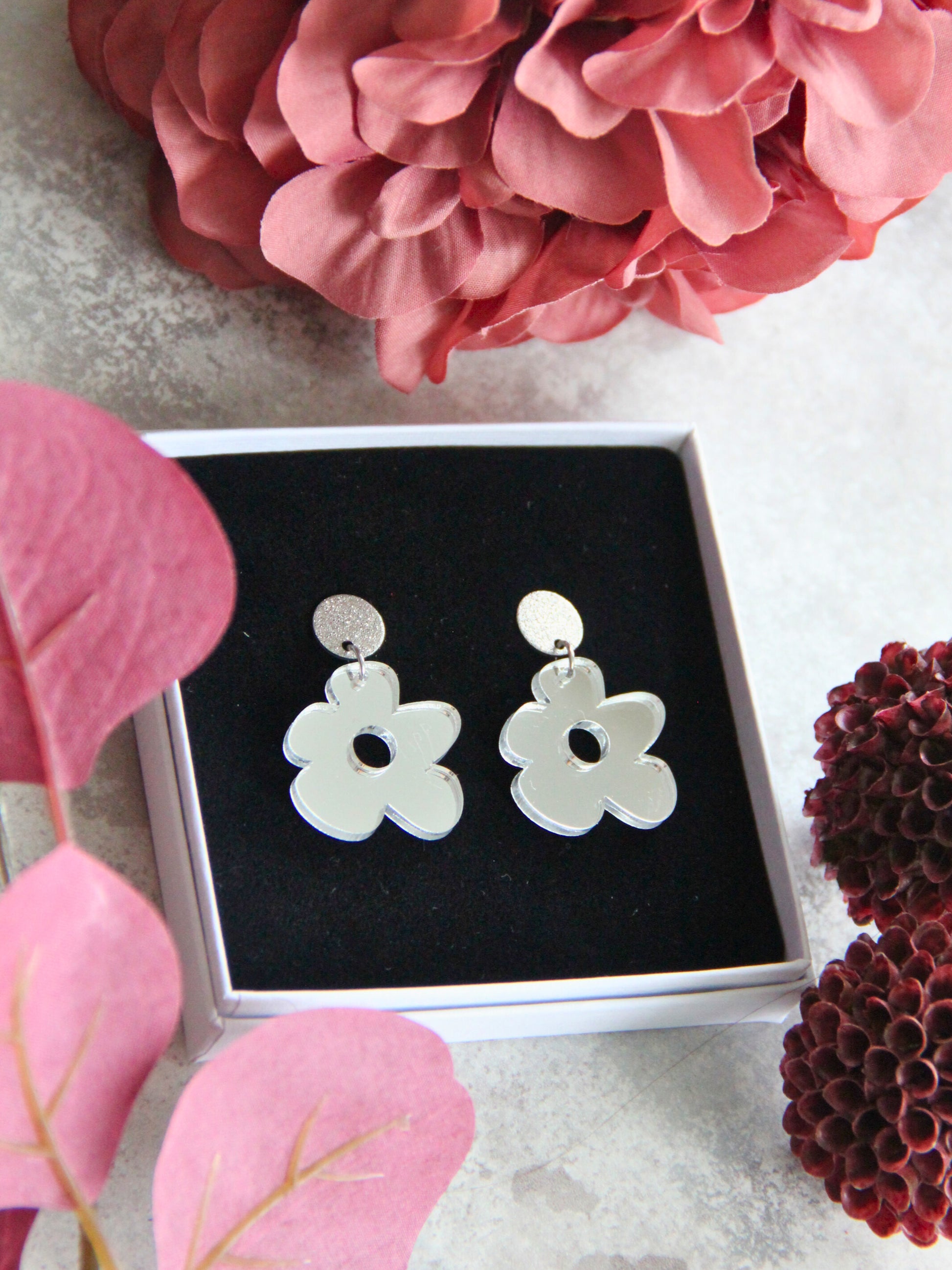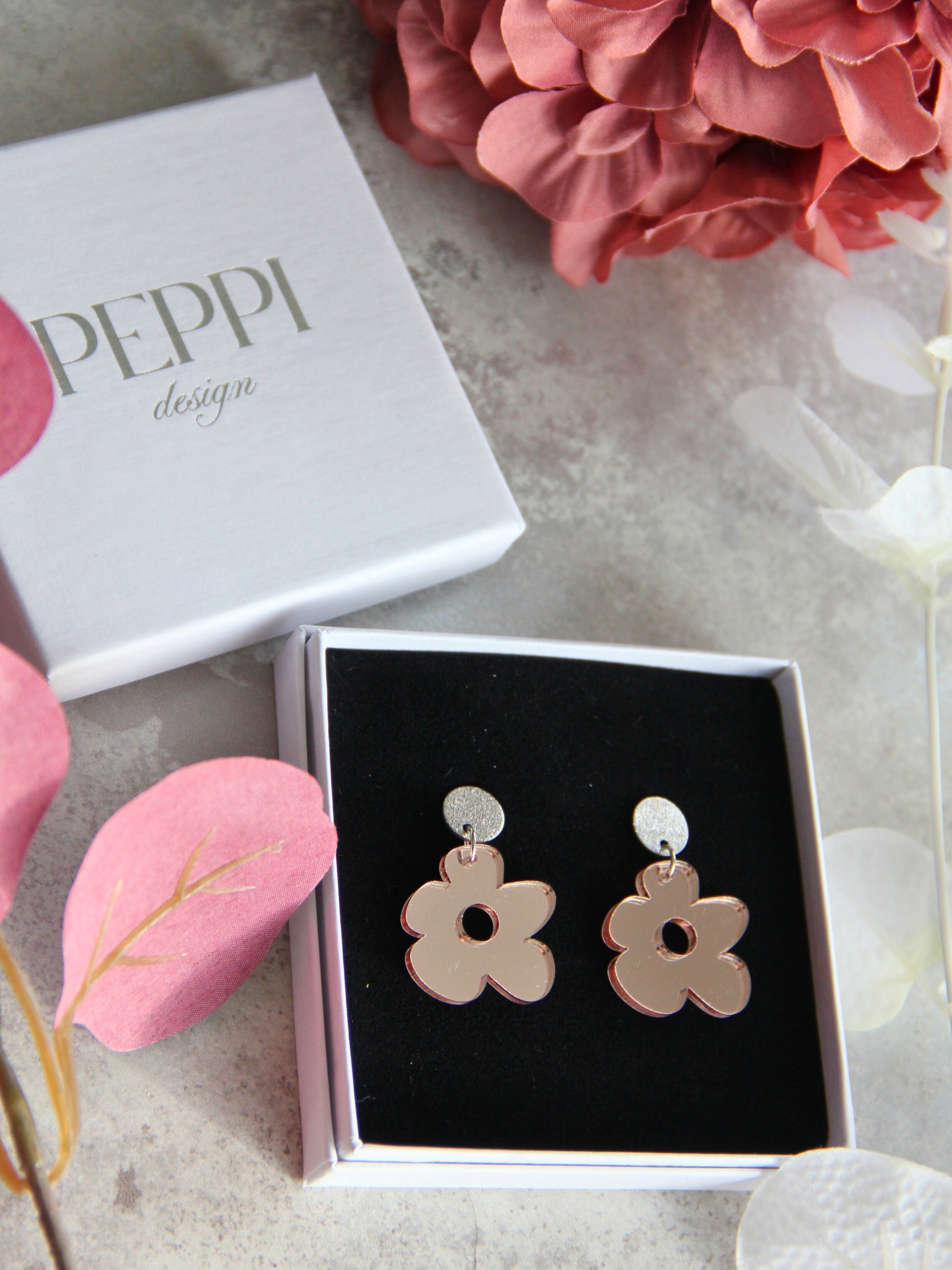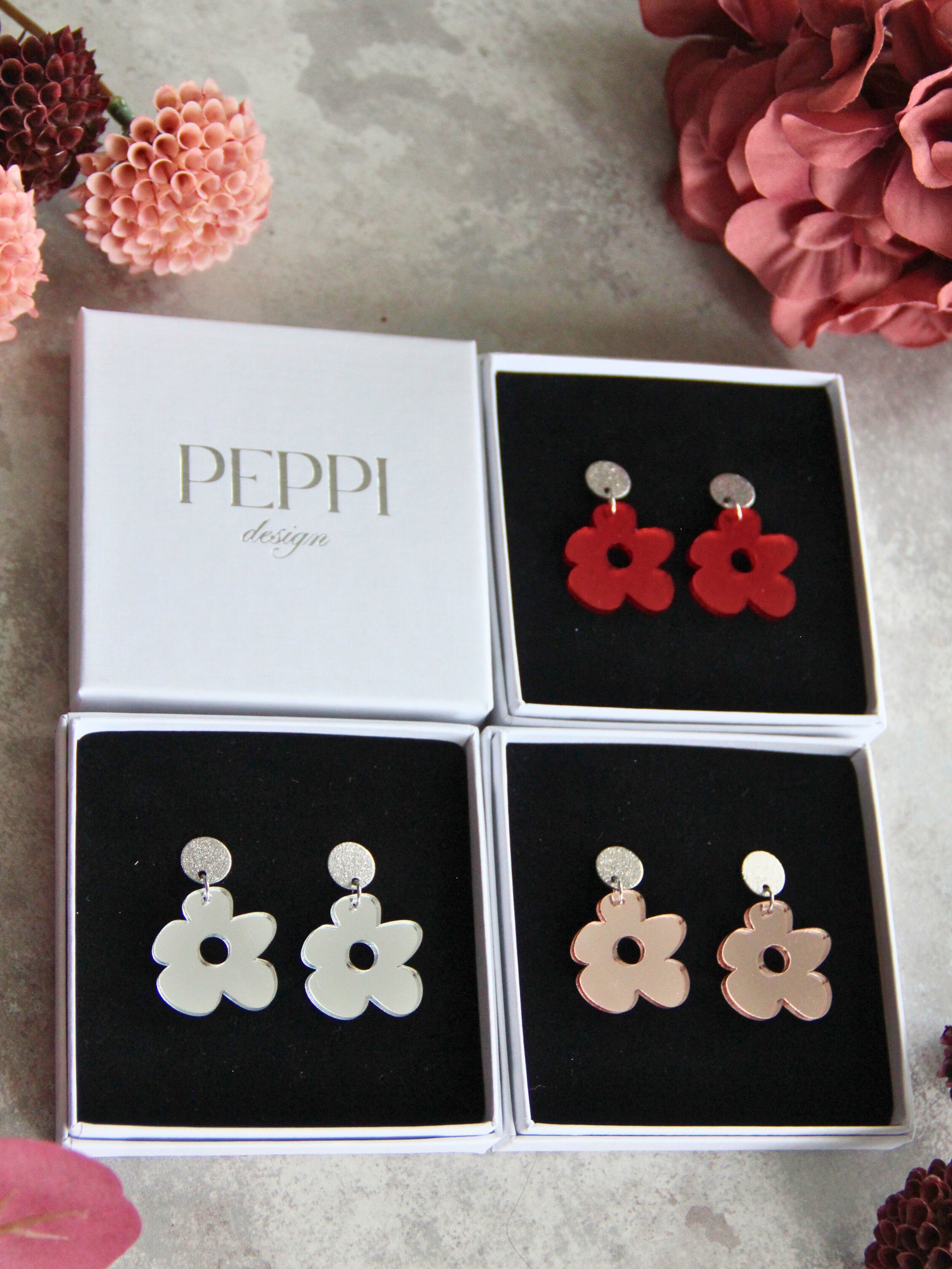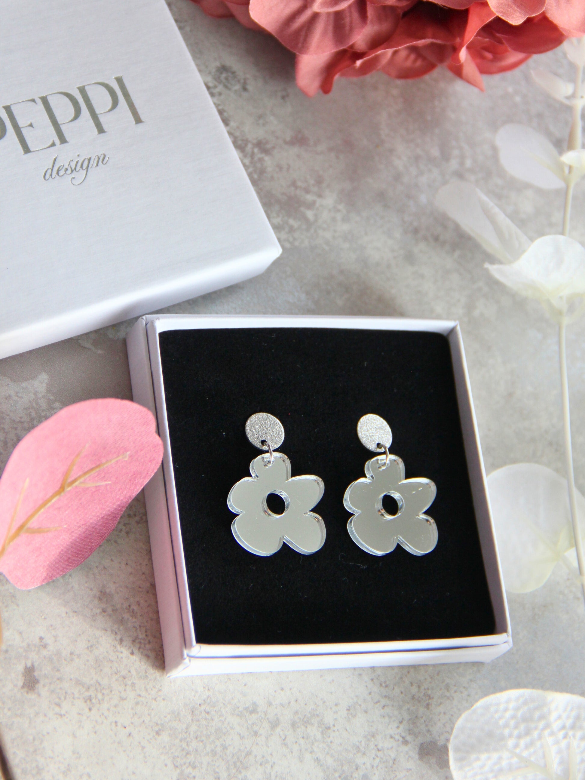 Tutut Pihlaja-korvikset kietoutuivat juhlavaan kuosiin ja niitä on saatavilla nyt kimaltavan peiliakryylisinä. Korun kruunaa kimalteleva nappiosa.