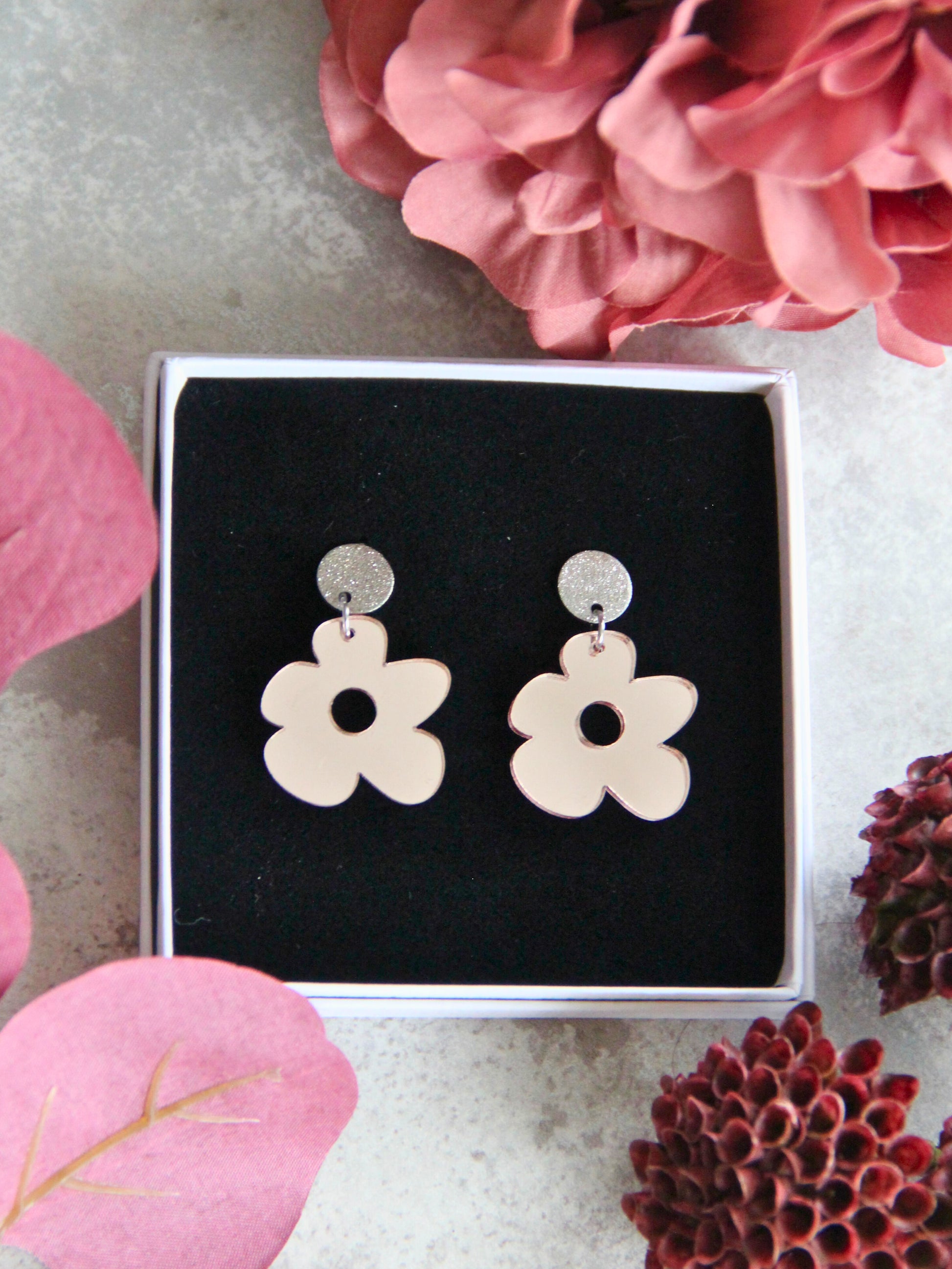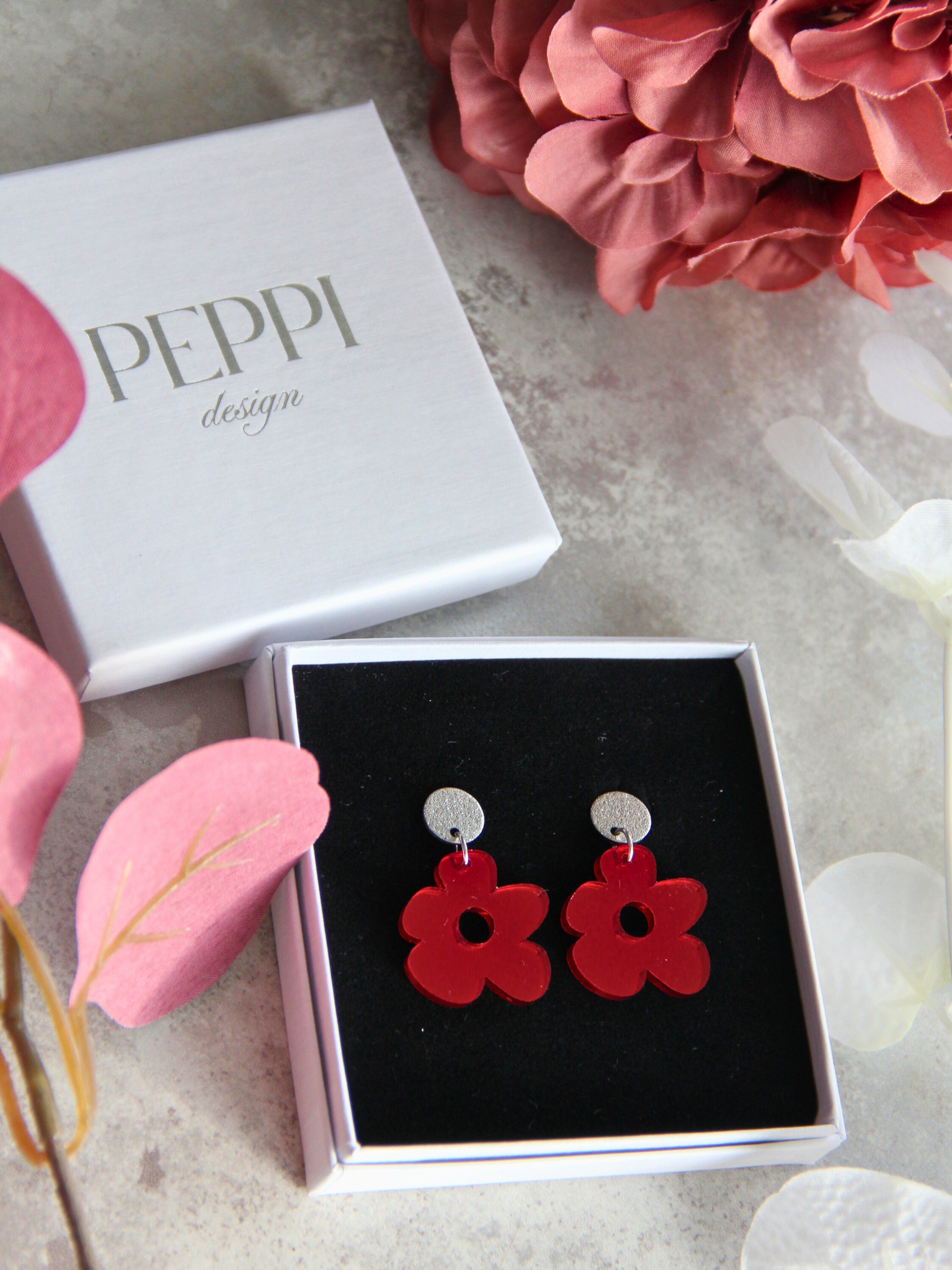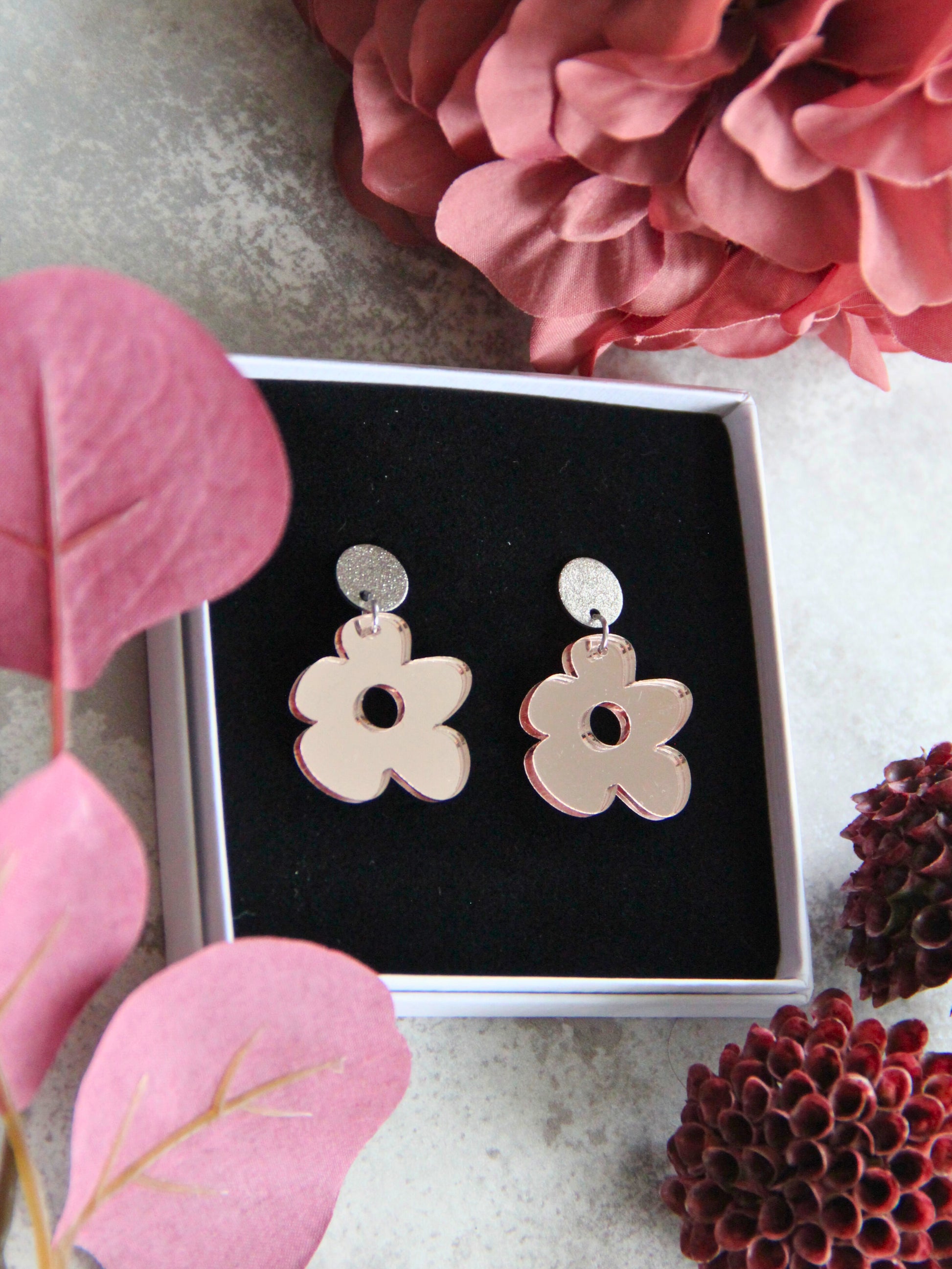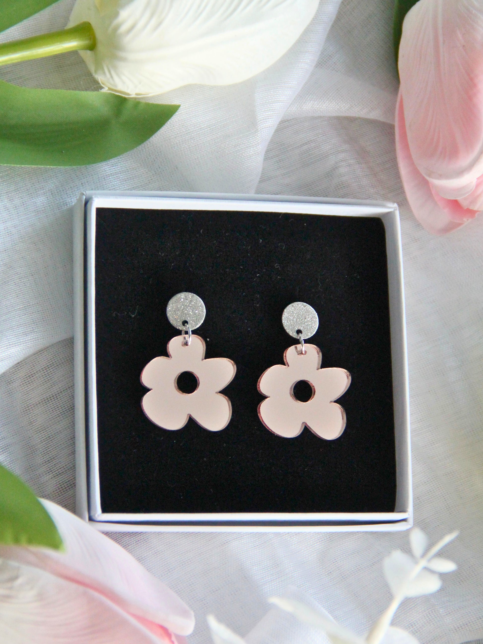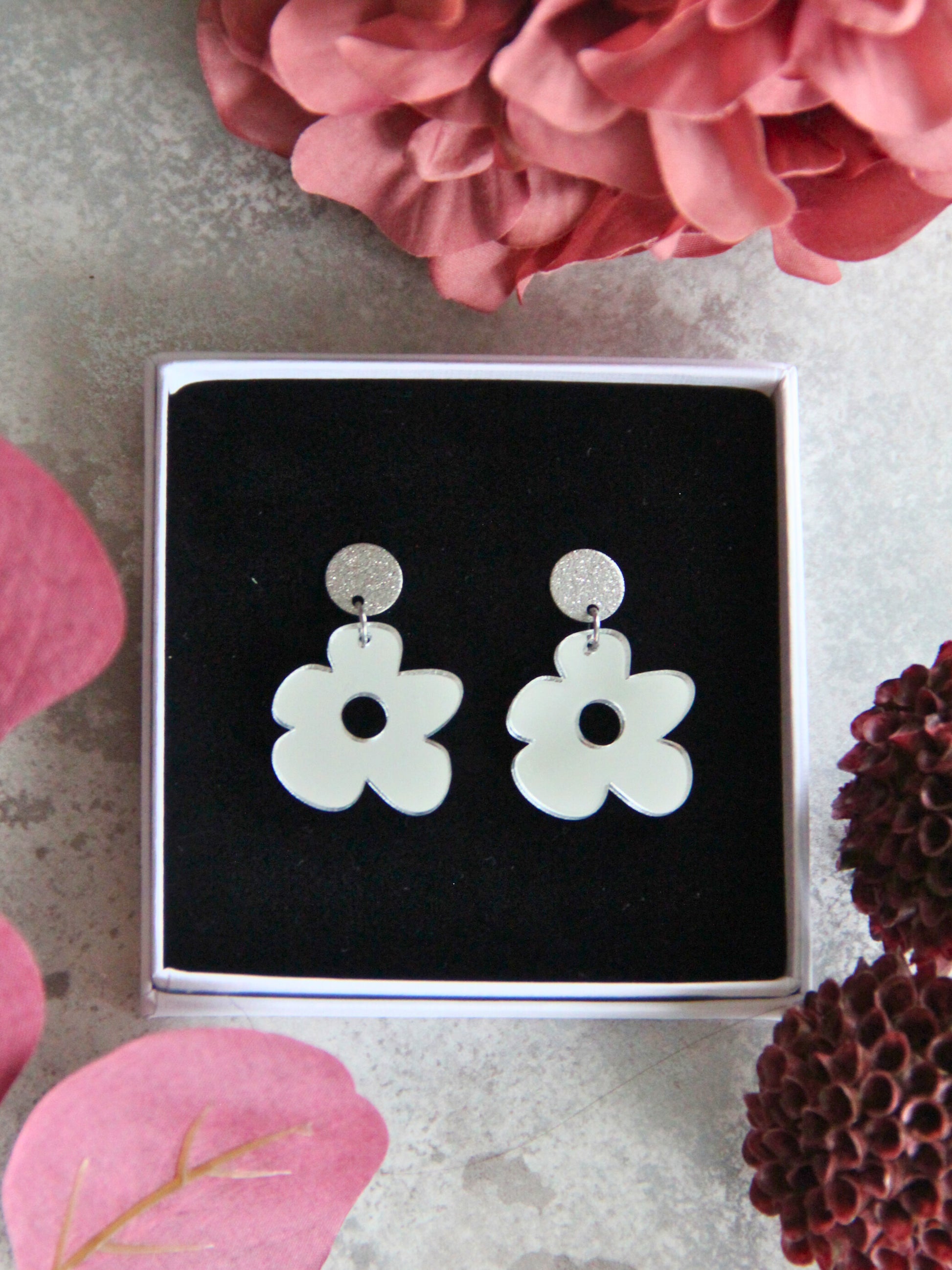 Tutut Pihlaja-korvikset kietoutuivat juhlavaan kuosiin ja niitä on saatavilla nyt kimaltavan peiliakryylisinä. Korun kruunaa kimalteleva nappiosa.