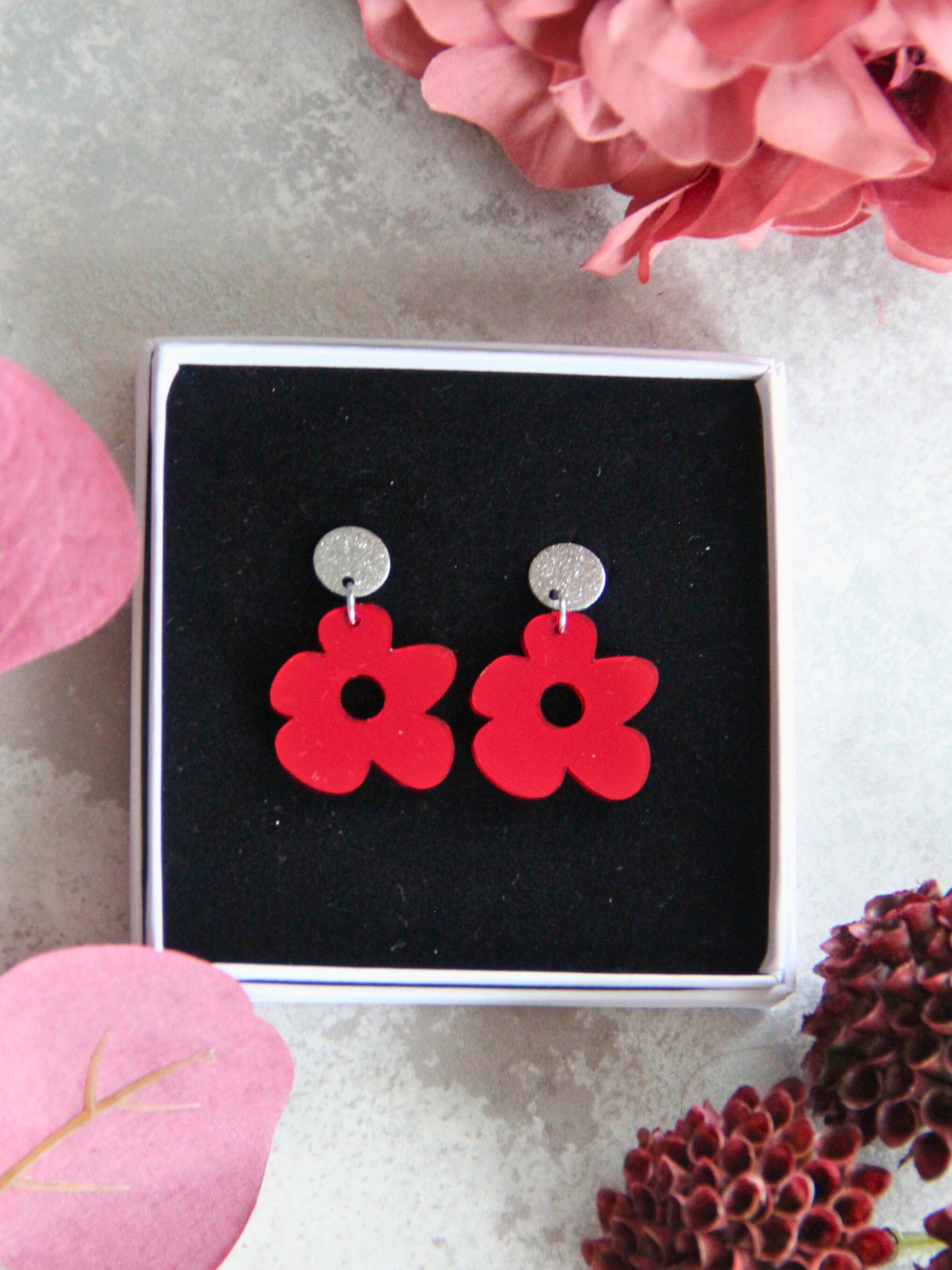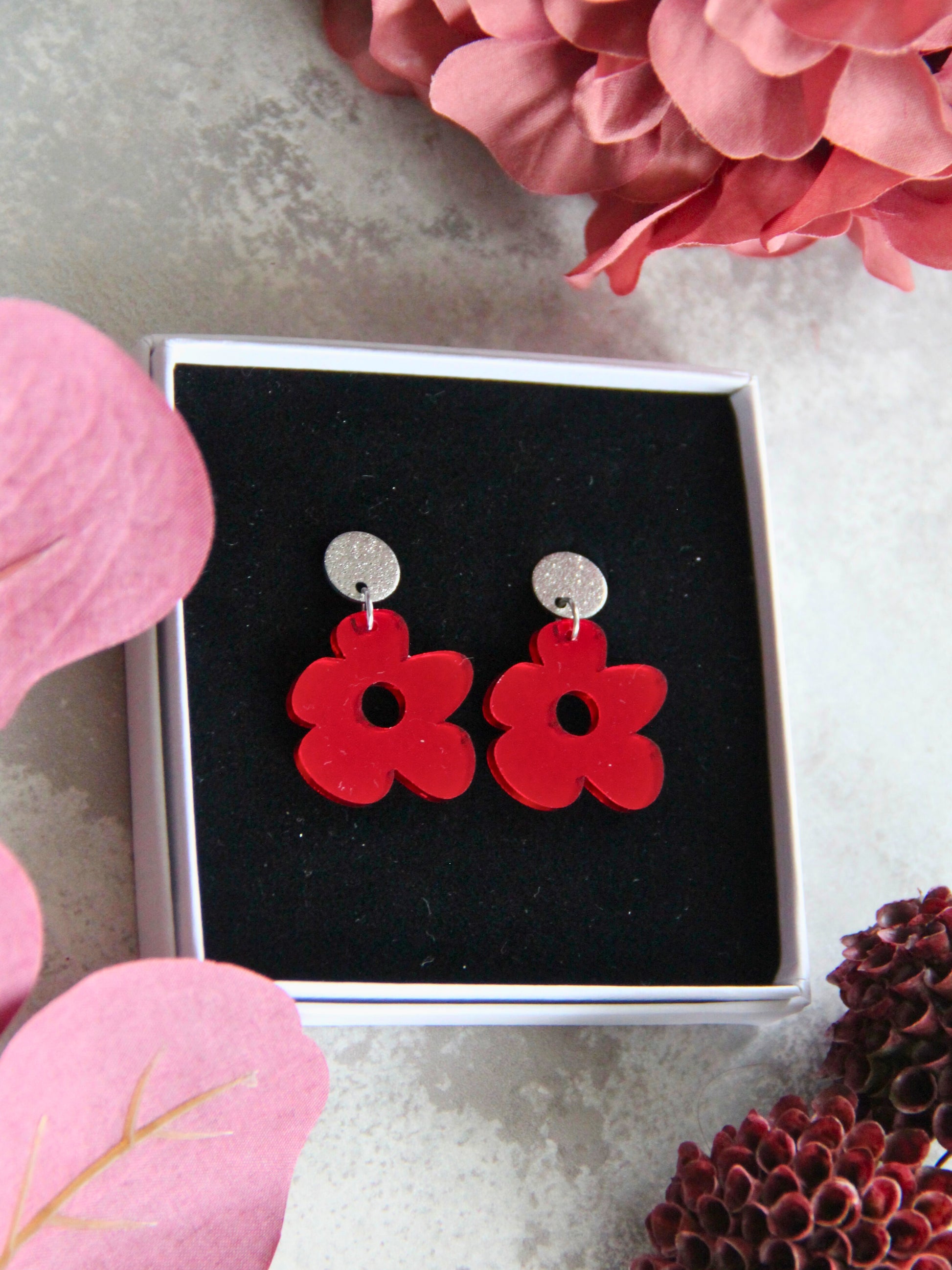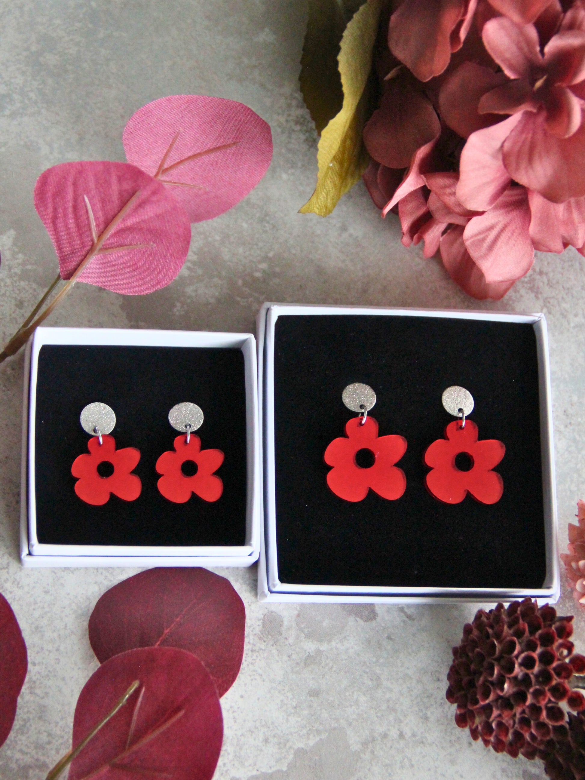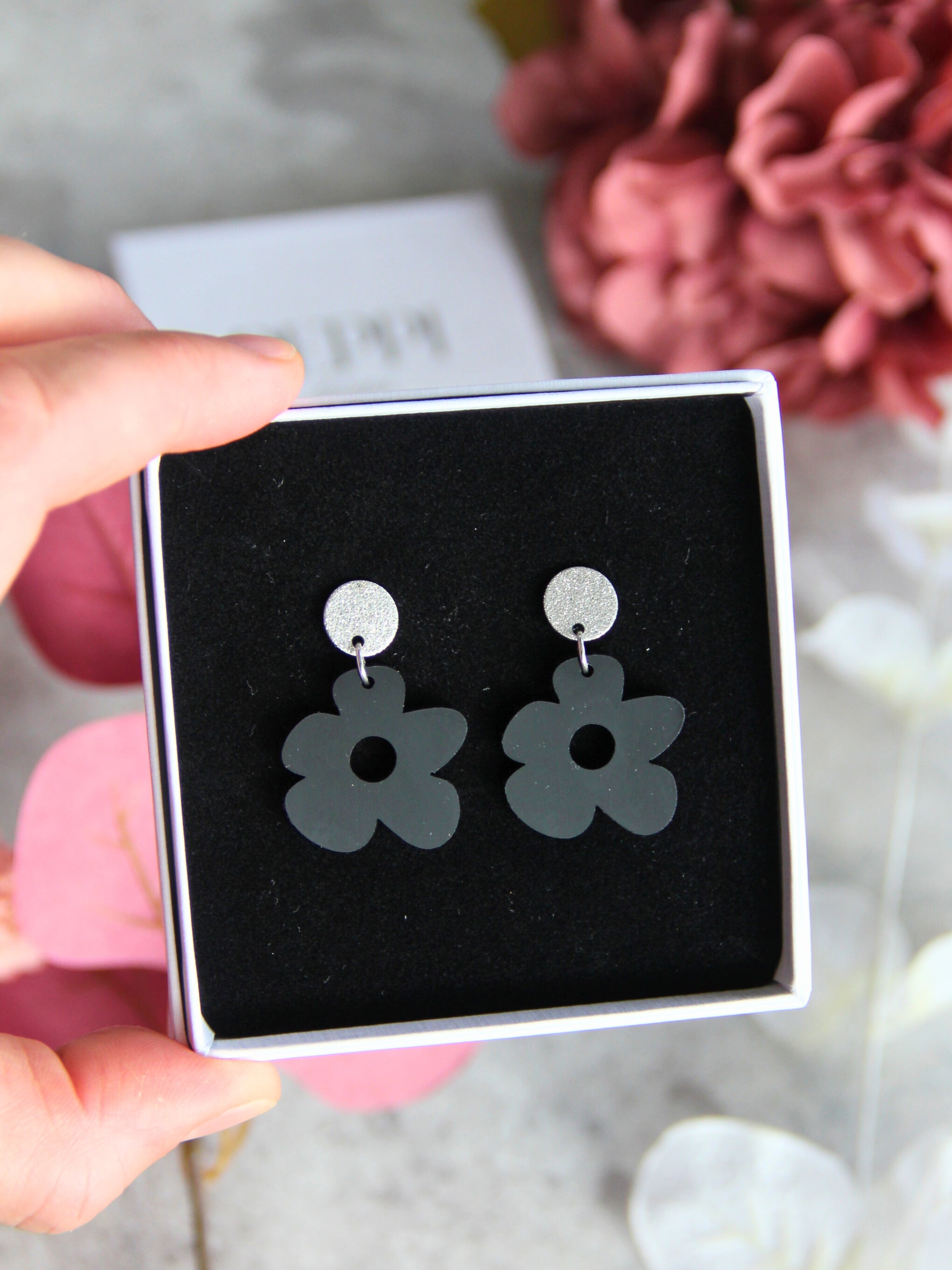 Tutut Pihlaja-korvikset kietoutuivat juhlavaan kuosiin ja niitä on saatavilla nyt kimaltavan peiliakryylisinä. Korun kruunaa kimalteleva nappiosa.
